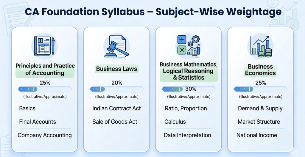 Many students begin CA Foundation preparation without clearly understanding what to study and how much importance each subject carries.